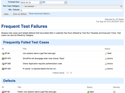 This report displays Test Cases (and related defects) that have failed often in selected Test Runs (filtered by Test Run Template and Execution Time). Test cases can also be filtered by Category.