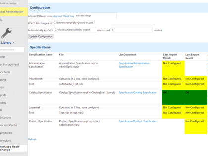 In the specification area below, you will see the status (needs configuration, successful export/import, unsuccessful export/import) of live docs/specifications that are suitable for Automated ReqIF export/import. For a specification to be automatically exported or imported, a manual export/import should be done first. Once a manual configuration has been set up that specifies mapping rules, the plugin will then use those settings for automatic import/export.