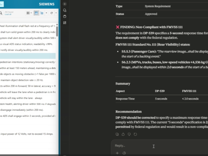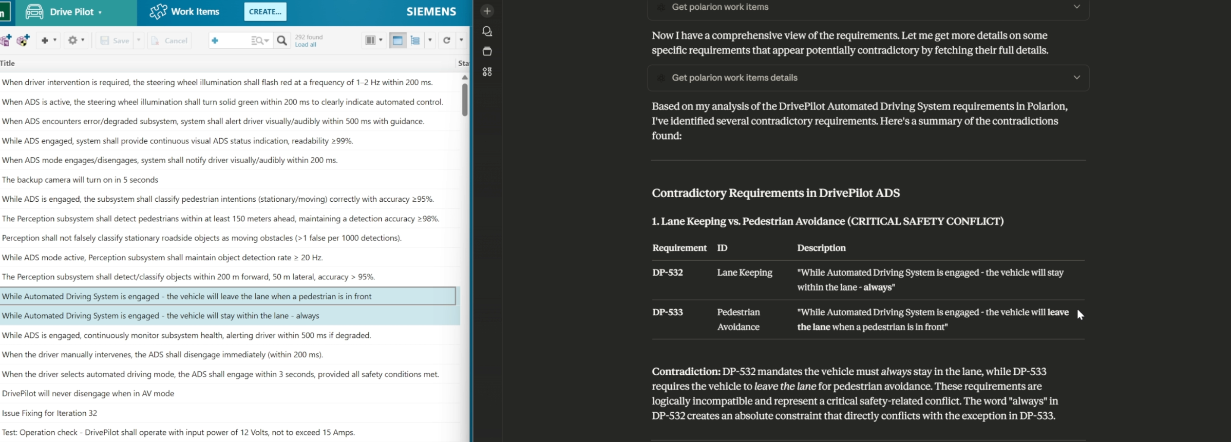 Ask questions like "Show me all safety requirements" or "Which requirements have no test coverage?" and get answers instantly without navigating the Polarion UI.